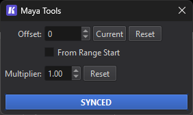 Maya Tools is a small toolset used to communicate with Maya from directly inside Keyframe Pro 2. With sync enabled, Keyframe Pro 2 will update the current Maya frame whenever the playback time changes -- time changes made in Keyframe Pro 2 are applied to Maya.