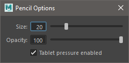 The Tool Options dialog provides access to the a tool's properties. Properties vary by tool and can include size, opacity, font and tablet pressure enabled.