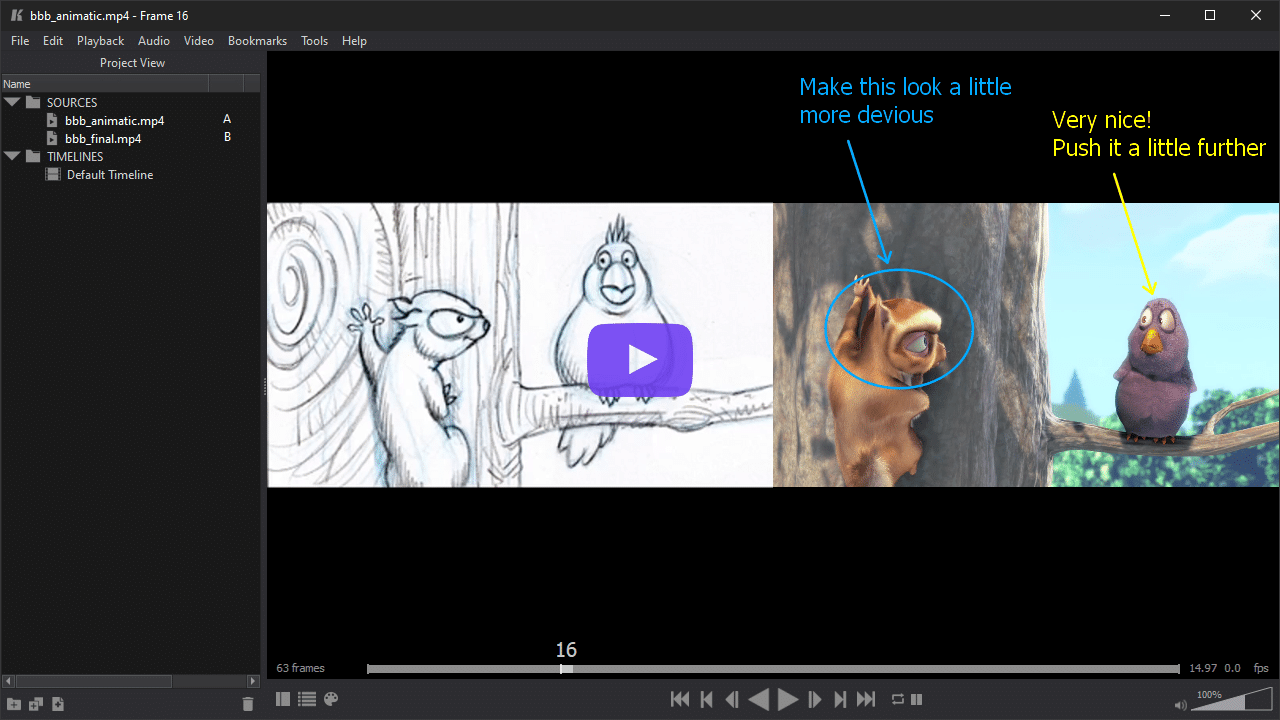 Split the viewer and compare shots side-by-side. Manage source files and timelines from the project view, swapping elements between viewers as desired.