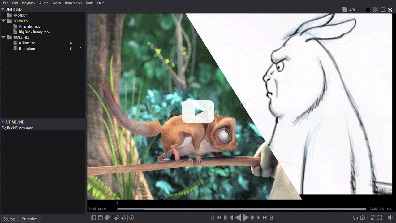 Compare shots using the A/B viewer (wipe/transparency) or split the viewer for a side-by-side review. Manage source files and timelines from the project view, quickly swapping elements between viewers.