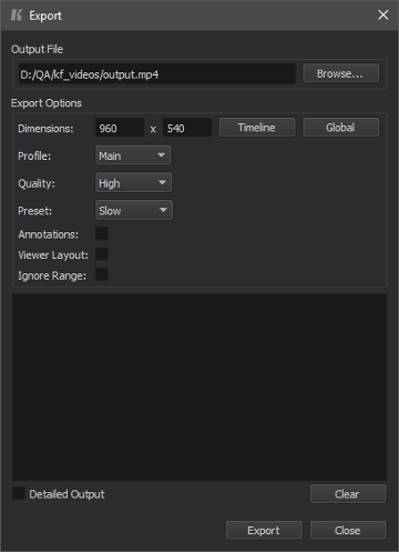 The export feature in Keyframe Pro allows users to easily convert an edited source or timeline into a standalone media file (.mp4 format). Using the export options, a user can specify the output resolution, profile, quality, viewer layout and whether or not to include annotations.