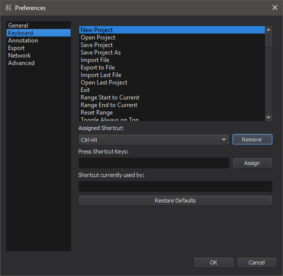 To access the Hotkey Manager, open up the Keyframe Pro preferences (Edit->Preferences...) and select the Keyboard tab: